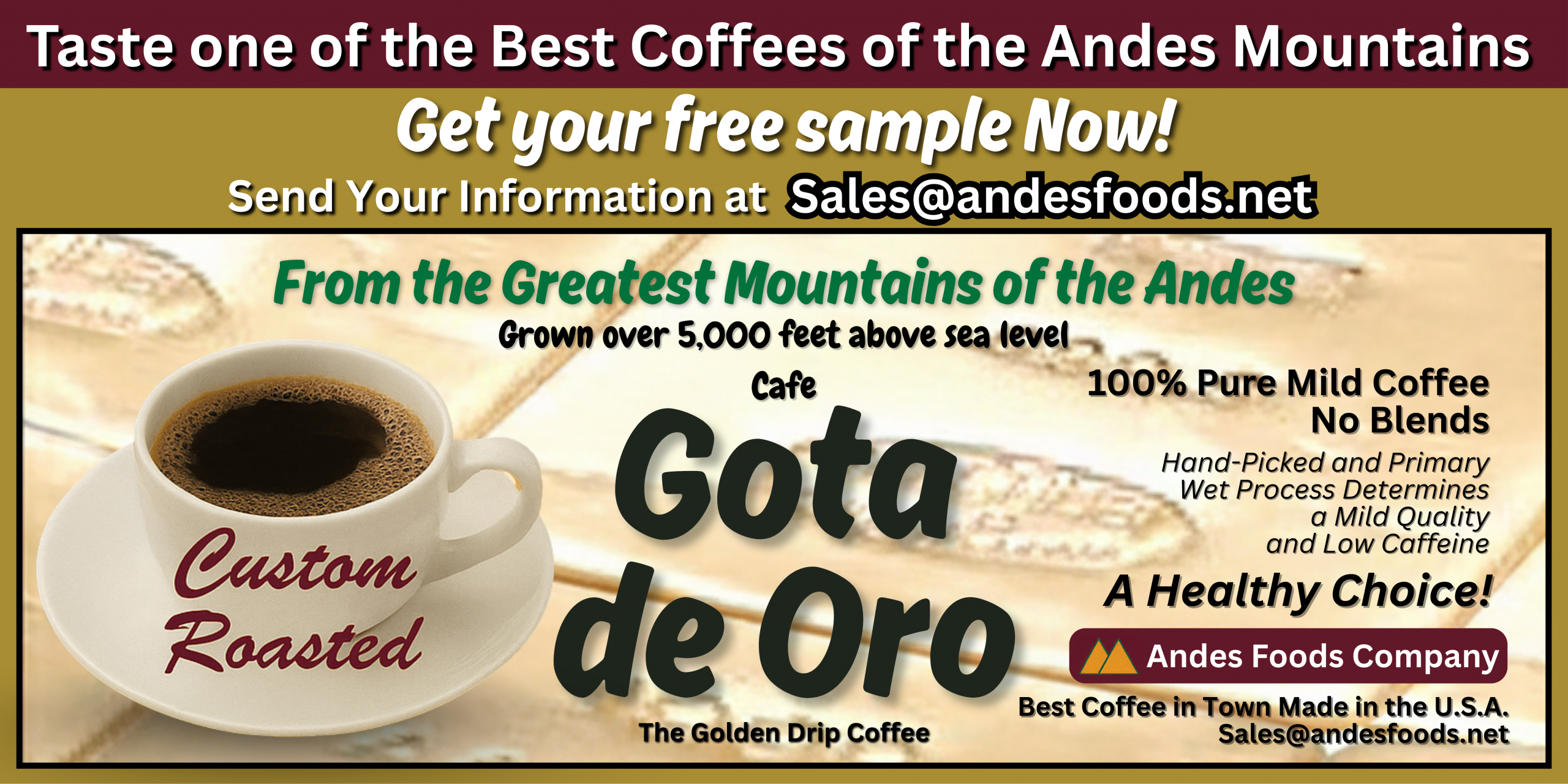 Discover Cota de Oro – The Golden Drip Coffee, a premium mild roast grown high in the Andes Mountains and hand‑picked for exceptional purity and flavor. With its smooth taste, low caffeine, and custom roasting in the USA, this coffee delivers a healthy, authentic experience in every cup. Perfect for anyone who loves clean, balanced, high‑quality coffee.